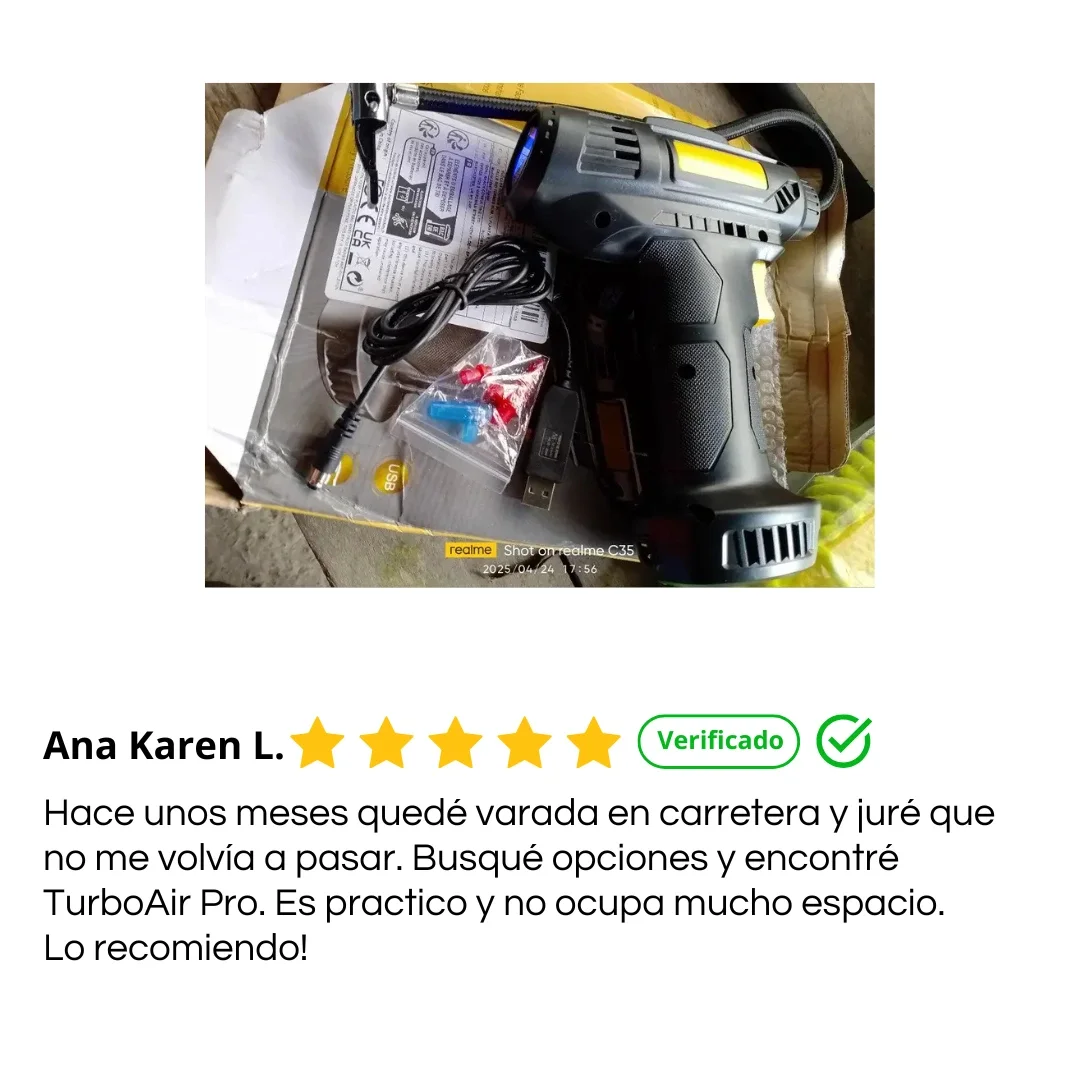 Nos salvo TurboAir Pro, me encontraba en carretera con mis hijos, y el tablero me marco llanta baja, no habia gasolineras cerca, recorde que tenia el Inflador en la cajuela, Me tomo minutos inflar la llanta. Llegamos seguros a nuestro destino!